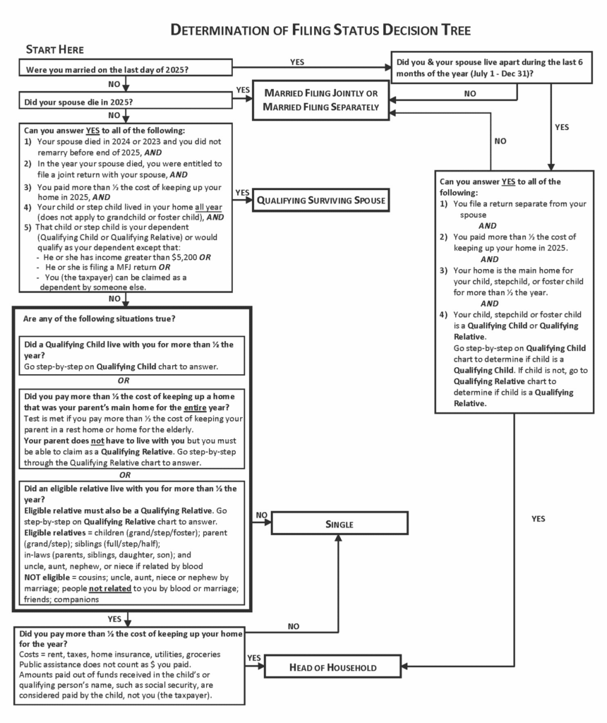 There are many rules regarding filing status.  To help ensure they are applied correctly, we have created a flow chart that takes all these rules into account.  You can see it here, but it can also  be found in the Volunteer Handbook (online or in the hard copy).   You start in the upper left hand corner answering the question about the taxpayer’s marital status on December 31 of the current tax year.   It also asks questions about dependents that would qualify a taxpayer for a particular filing status and whether or not the taxpayer pays over half the cost of a home.  Please make it a practice to use this flowchart when determining taxpayers’ filing status.  Do not guess or try to rely on memory, or even use logic. Tax laws are not always logic.